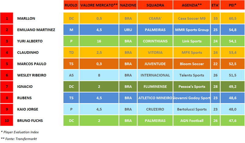 L'uruguaiano Emiliano Martinez del Palmeiras si piazza al secondo posto mentre il giovane centravanti del Corinthians Yuri Alberto è terzo con la sua tripletta all' Internacional di Porto Alegre.