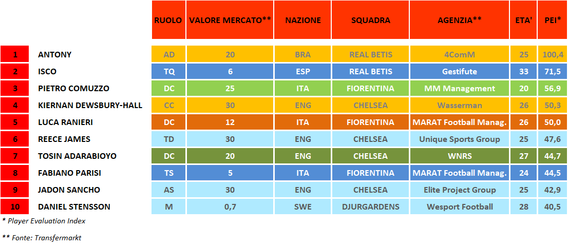 In Conference League doppietta del Betis per il primo e secondo posto della nostra classifica con Antony e Isco. Non basta alla Fiorentina piazzare tre giocatori tra i primi dieci: Comuzzo, Ranieri e Parisi.