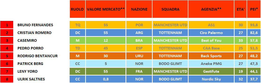 Senza storia già dall'andata le semifinali di Europa League. Sul nostro podio troviamo, oltre al vincitore Bruno Fernandes, il Cuti Romero del Tottenham e Casemiro del Man Utd. Pedro Porro e Bentancur completano la tripletta del Tottenham mentre l'interessantissimo e già super costoso Leny Yoro chiude per il Manchester.
