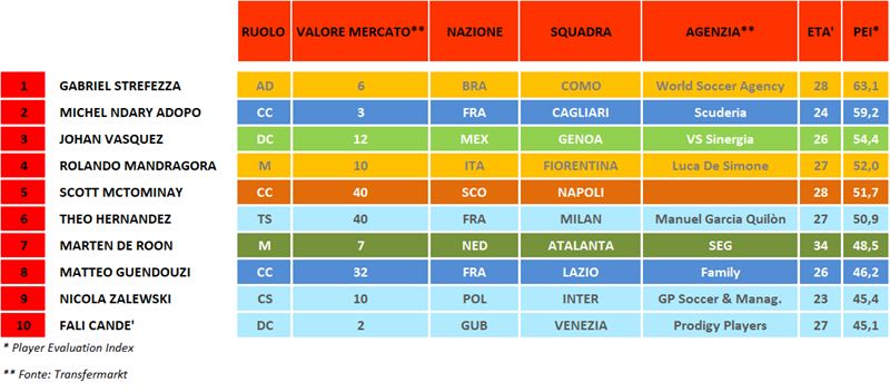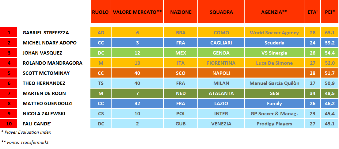 Il criticatissimo (a volte) Hernandez fa invece registrare sempre numeri importanti e anche in classifica generale complessiva si piazza al terzo posto. Sicurezze anche De Roon e Guendouzi, mentre si fa vedere per la prima volta Zalewski. Anche Candè del Venezia non è più una sorpresa. Ottimo investimento die lagunari