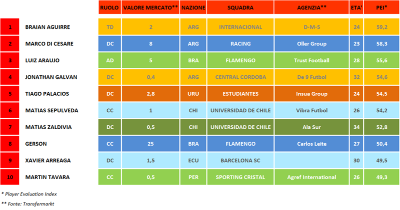 Il Flamengo piazza in classifica un altro giocatore molto forte, il centrocampista Gerson. Anche L'Universidad de Chile ha due giocatori nel ranking: Matias Zaldivia e Matias Sepulveda, rocciosi difensori che contribuiscono con un gol a testa nella roboante vittoria contro il Carabobo.