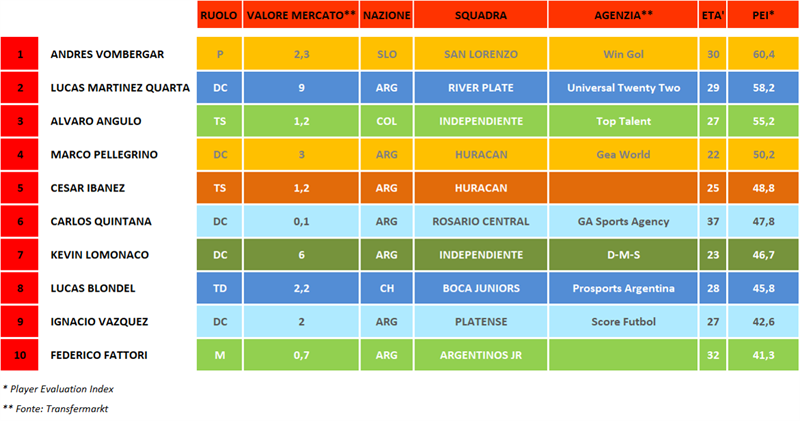 Terzo posto per il goleador della Bombonera Alvaro Angulo e ottimi piazzamenti per i laterali di Boca e Huracan Blondel e Ibanez. Il grande "cervello" dell'Argentinos Federico Fattori stavolta non è bastato ai biancorossi della Paternal.
